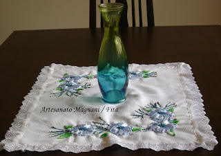 Pano de copa branco - Flores de cetim bordada sobre etamini, folhas bordadas em linha e pedrarias